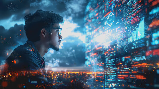 Portrait of a young man analyzing digital data on a futuristic interface in a vibrant urban setting under a dramatic sky at night