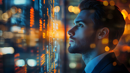 An image depicting a man standing before a futuristic cityscape with a complex digital interface overlay