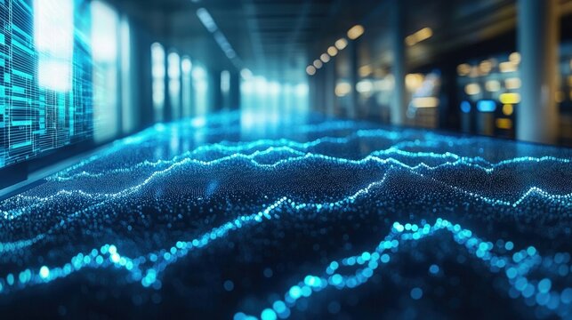 Abstract visualization of data waves in a high-tech environment showcasing dynamic patterns and glowing elements on a digital interface with a futuristic ambiance