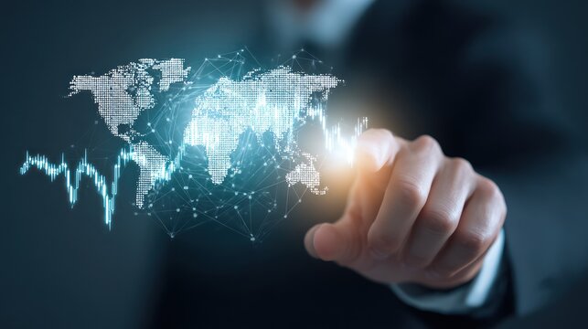 A businessman interacts with advanced touchscreen technology in an office, featuring a digital world map, colorful graphs, and visual data representations.