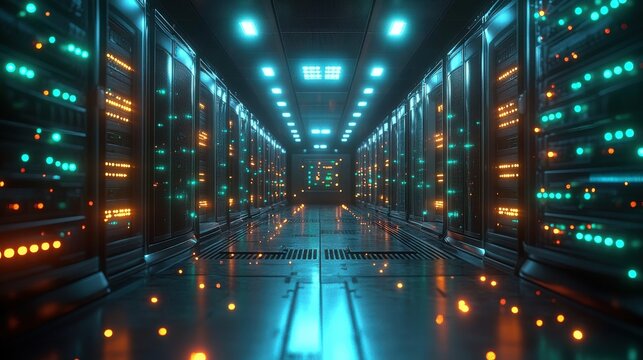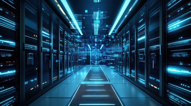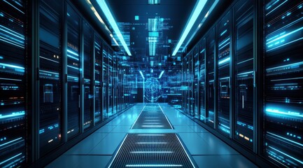 Illuminated high-tech data center corridor digital infrastructure technology environment futuristic viewpoint