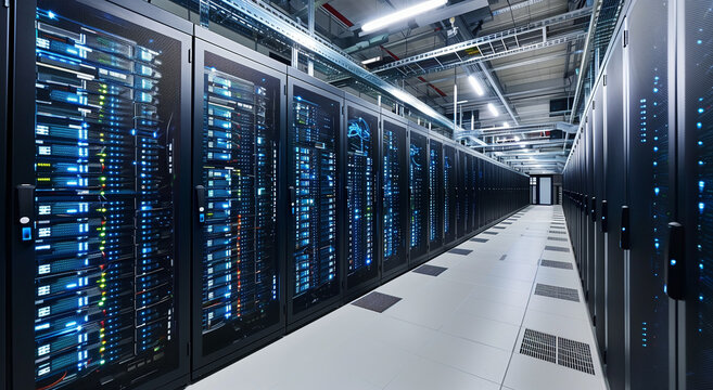 Busy Data Center Corridor: Rows of Rack Servers and Supercomputers with Internet Visualization
