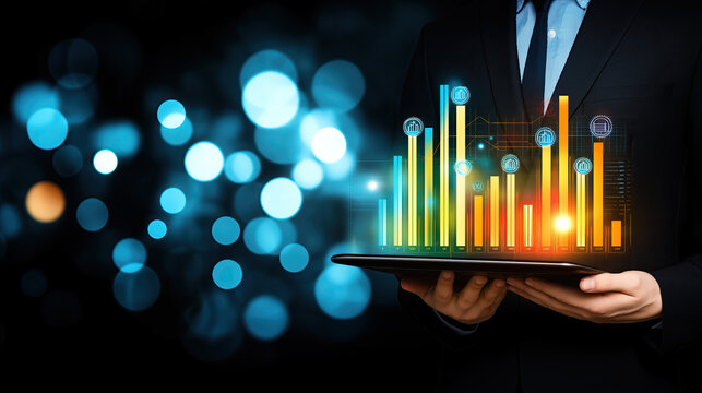 Businessman holding a tablet with virtual 3d charts and graphs.Business growth, success and prosperity.Futuristic modern background for website design,business