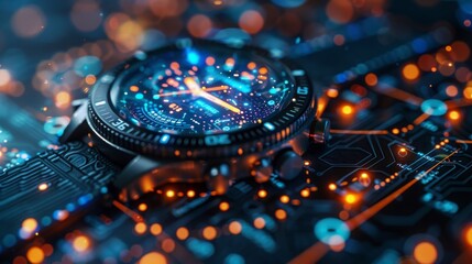 A futuristic circuit board with glowing components, showcasing advanced technology and intricate design.