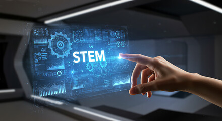 STEM Education Concept: A hand touches a futuristic interface displaying data, charts, and the word STEM.