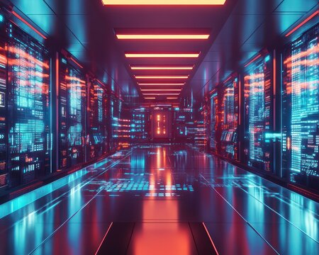 Glowing server racks with holographic hud and neon light in futuristic data center corridor