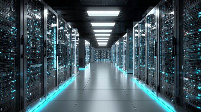 Blue data center corridor with glowing rack servers, fiber cables and network led lights