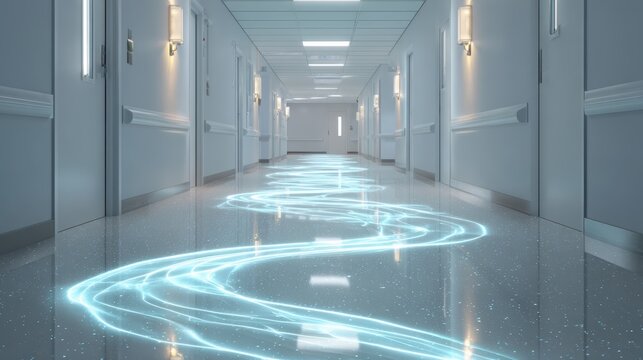 Digital Corridor: A futuristic image of a hallway with an ethereal blue digital energy stream down the center, representing the flow of data or information.