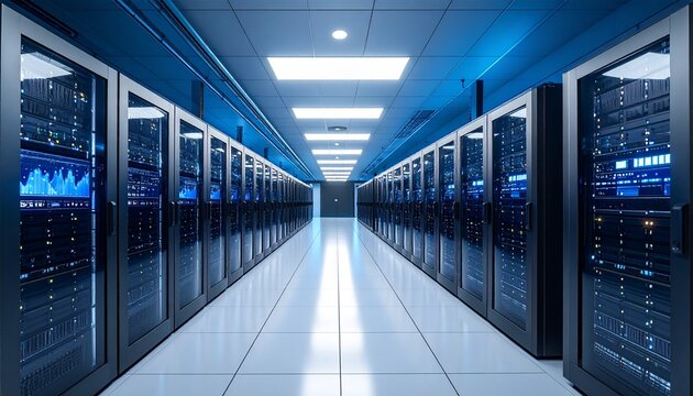 High-tech data center corridor with rows of modern server racks for network and cloud computing storage
