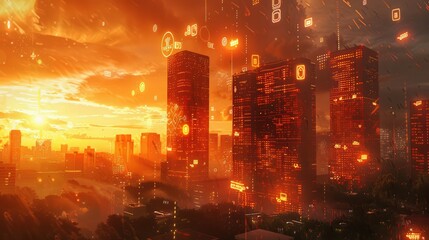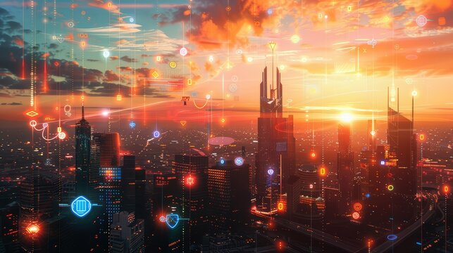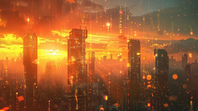 Binary code overlaid on a cityscape during sunset, symbolizing digital transformation