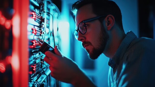 Displaying server rack showing holographic overlays in data center, with bundled cables, LED lights