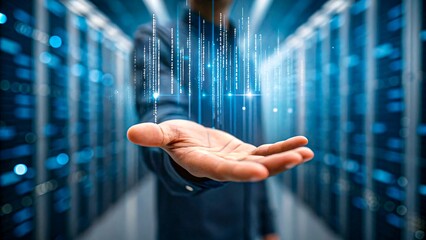 Glowing digital code on futuristic server racks in high tech data center, great for illustrating cloud computing, artificial intelligence, and cybersecurity environments