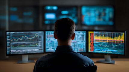 Human eye view of digital finance consultant reviewing cryptocurrency market trend multi monitor setup business intelligence software custom financial data center background cut out isolated