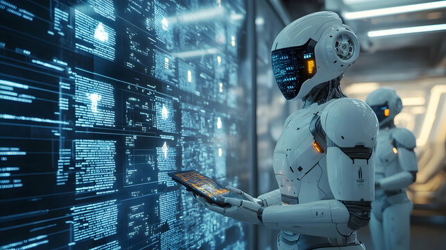 Innovative robot analyzing data in futuristic lab technology center digital art high-tech environment close-up view ai concept