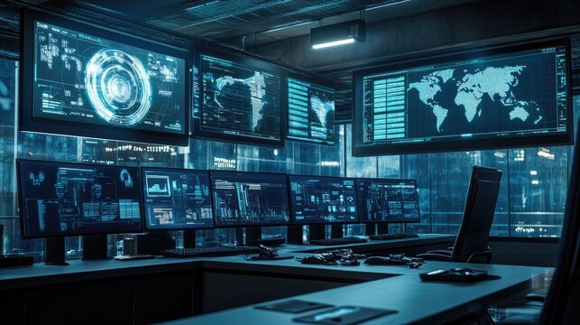 A high-tech control room with logistics managers monitoring screens displaying real-time data on shipments