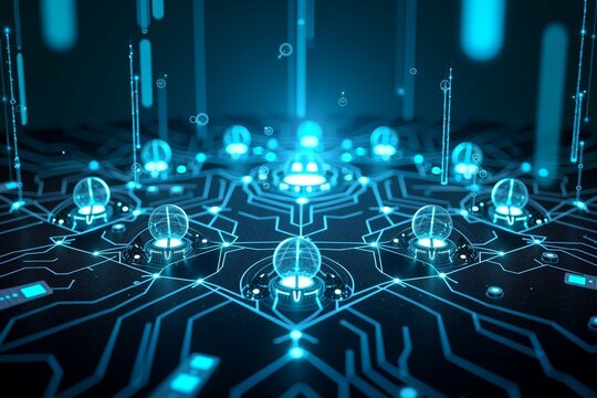 Futuristic circuit board glowing blue, interconnected nodes and data streams symbolizing advanced technology and digital connectivity.