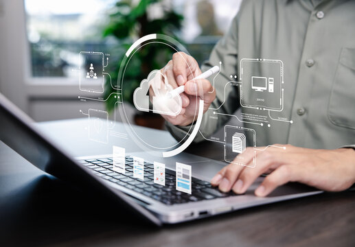Cloud technology concept Global network of metaverse systems concept, Man hand touch data with internet cloud technology and File Transfer backup copy,Global business  Internet for Telecommunication
