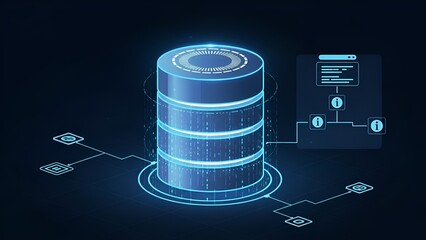 Futuristic Isometric Database Server with Glowing Data Connections and Network Architecture Display