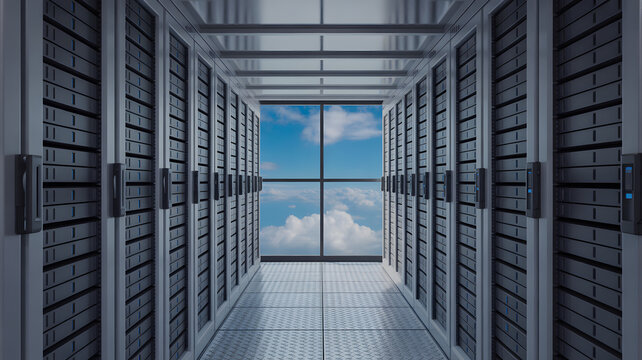 Modern data center aisle lined with numerous server racks extending to a large window revealing a clear blue sky and white clouds symbolizing cloud te