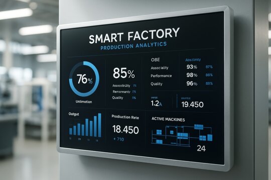Smart factory digital dashboard displaying production analytics and performance metrics on a screen in a high-tech industrial environment. Ai generative