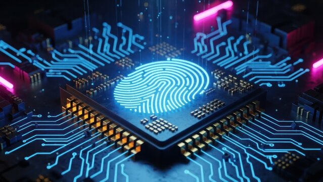 A glowing digital fingerprint embedded in a futuristic circuit board, illuminated with neon blue and green lights