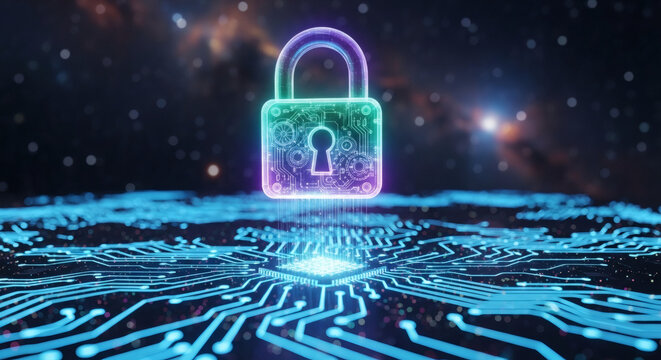 Digital padlock with circuit board background for cybersecurity
