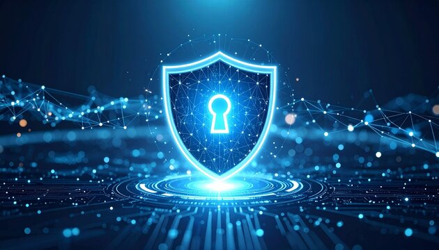Glowing blue shield with keyhole floats in digital space—symbol of cybersecurity, data protection, and secure access in a futuristic tech environment.