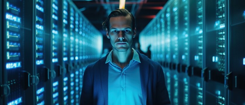 IT Engineer in big database server center office, High Speed Data Transfer, Server Transfer, Technology Science Breakethrough, Progress, Innovation Concept, AI generative.