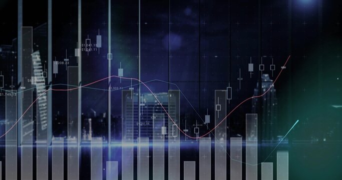 Night cityscape backdrop with dynamic stock market graph overlaid