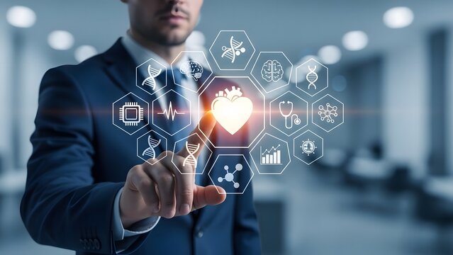 Businessman interacting with futuristic digital interface in modern office setting with glowing hexagon icons