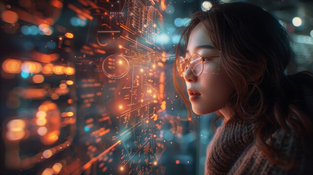 A woman wearing glasses looks intently at a holographic screen displaying complex mathematical equations.