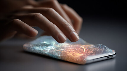 Close-up of a sleek smartphone displaying a vibrant and dynamic holographic interface on its screen.