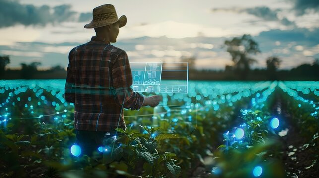 Farmer Monitoring Crops with Holographic Interface Displaying Real Time Data