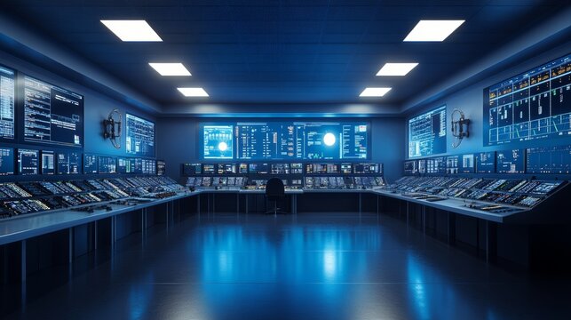 Empty modern security control room with multiple screens displaying data and surveillance feeds. Central command center for monitoring and data control.