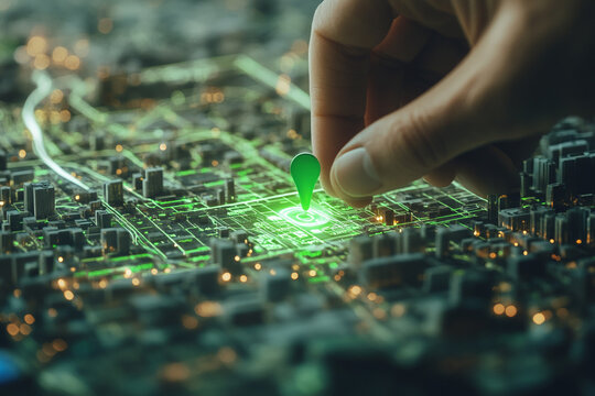 Hand placing green location pin on glowing city map model smart city technology