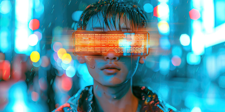A man wearing futuristic glasses with holographic displays walks down a city street at night.