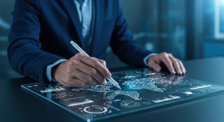 Person in suit uses stylus on futuristic transparent screen with data.