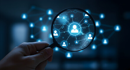 Hand Holding Magnifying Glass Over Network of Glowing People Icons on Blue Background