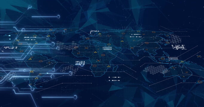 Image of glowing motherboard and processing data over world map on dark background