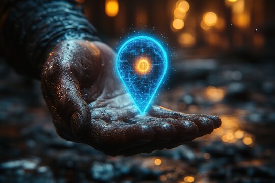 Person Working on Laptop in Modern Office with Futuristic Digital Interface at Sunset Over Cityscape, Vibrant Colors and Technology Elements