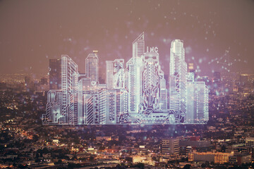 Double exposure of buildings hologram over cityscape background. Concept of smart city.