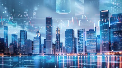 Abstract cityscape with digital data overlay, featuring glowing bars and a futuristic ambiance