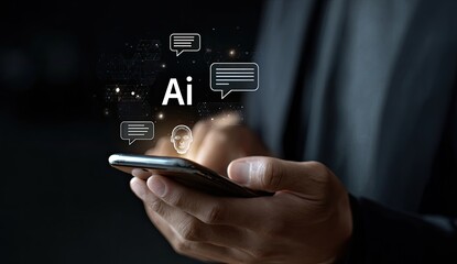 Close-up of person holding smartphone with AI and chat icons overlayed