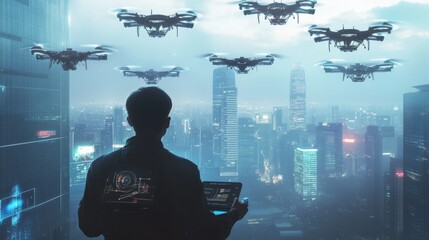 Visionary Controlling a Futuristic Urban Interface with Advanced Technology Holograms Overlooking a Megacity