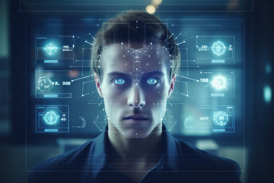 Futuristic Interface Surrounding Young Man Showing Advanced Biometric Scanning System Technology. Face detection.