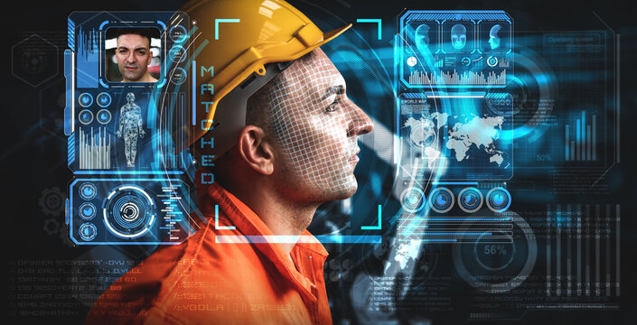 Facial recognition technology for industry worker to access machine control . Future concept interface showing digital biometric security system that analyze human face to verify personal data .