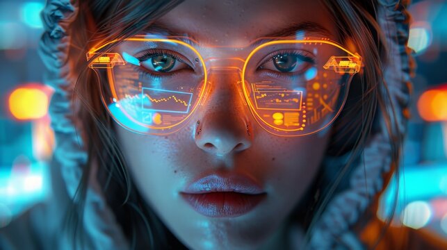 Close-up of a woman with futuristic AR glasses, displaying digital overlays.