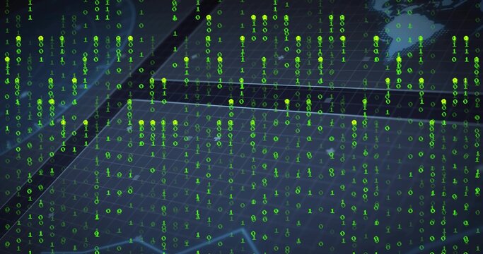 Futuristic digital interface with binary streaming and world map