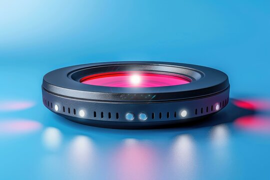 Round scanner processing data against glowing light on blue background.