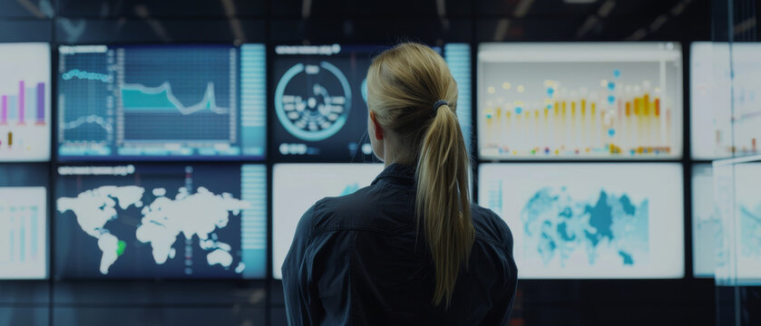 High tech computer screens display data analytics and global maps in futuristic environment, showcasing advanced technology and innovation